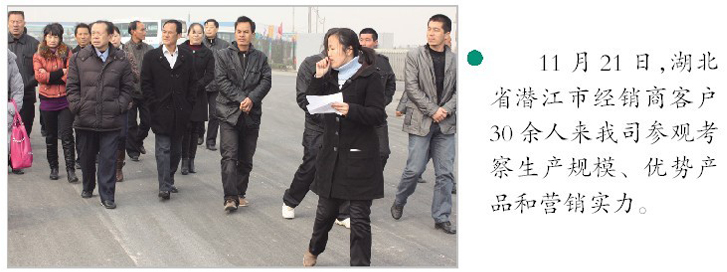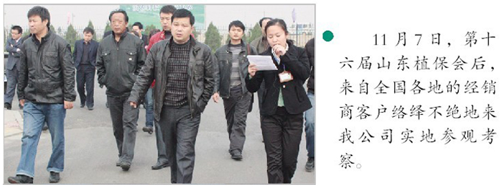 時(shí)間:2012-08-10 14:56隨著濱農(nóng)品牌美譽(yù)度的不斷提升,各地客戶(hù)對(duì)濱農(nóng)的認(rèn)同度不斷加深。初冬時(shí)節(jié),農(nóng)化市場(chǎng)進(jìn)入銷(xiāo)售淡季,全國(guó)各地經(jīng)銷(xiāo)商客戶(hù)紛紛慕名來(lái)我司參觀考察,意在全方位考察我公司生產(chǎn)實(shí)力、產(chǎn)品特色、新品上市等情況。公司解說(shuō)員張娜、常海燕、舒麗麗與公司隨行業(yè)務(wù)人員分別向一批批客戶(hù)介紹著濱農(nóng),并陪同客戶(hù)朋友們實(shí)地參觀制劑生產(chǎn)線、成品倉(cāng)庫(kù)、研究所等,及時(shí)向客戶(hù)解疑答惑。來(lái)訪客戶(hù)紛紛表示,通過(guò)參觀他們更真實(shí)的了解了濱農(nóng)的生產(chǎn)規(guī)模、產(chǎn)品結(jié)構(gòu)及綜合實(shí)力,與濱農(nóng)的合作前景更加廣闊,信心更加堅(jiān)定。