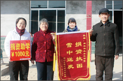 2011年1月24日,人力資源部主任戚哲芬代表公司為東寨子村石承承同學(xué)送去助學(xué)金1000元,并向其家人致以節(jié)日的問候。石承承及家人為感謝公司多年來(lái)的照顧,將一面“捐資扶困,雪中送炭”的錦旗送到戚主任手中。石承承表示今后一定好好學(xué)習(xí),不辜負(fù)大家的期望,學(xué)有所成后,志愿投身到公司的發(fā)展建設(shè)中,為濱農(nóng)盡一份自己的綿薄之力。