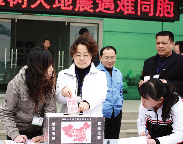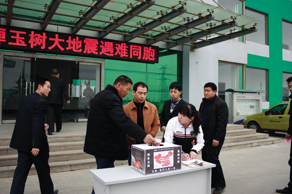 4·14青海玉樹(shù)地震發(fā)生后,我公司全體干部員工十分關(guān)注來(lái)自災(zāi)區(qū)的一切消息。4月21日上午10時(shí),值此全國(guó)哀悼日,我公司黨總支、工會(huì)組織了“情系玉樹(shù),真愛(ài)無(wú)疆”自愿捐款活動(dòng),集團(tuán)董事長(zhǎng)黃延昌、總經(jīng)理任立明率先捐款,全體高中層干部在辦公樓前參加了集體捐款活動(dòng)。集團(tuán)公司各部門(mén)、車(chē)間員工也紛紛自發(fā)捐款,集中將善款交到了企業(yè)文化部;顒(dòng)結(jié)束后,累計(jì)捐款近五萬(wàn)元,這批善款將用于馳援災(zāi)區(qū)同胞抗震救災(zāi),重建家園。